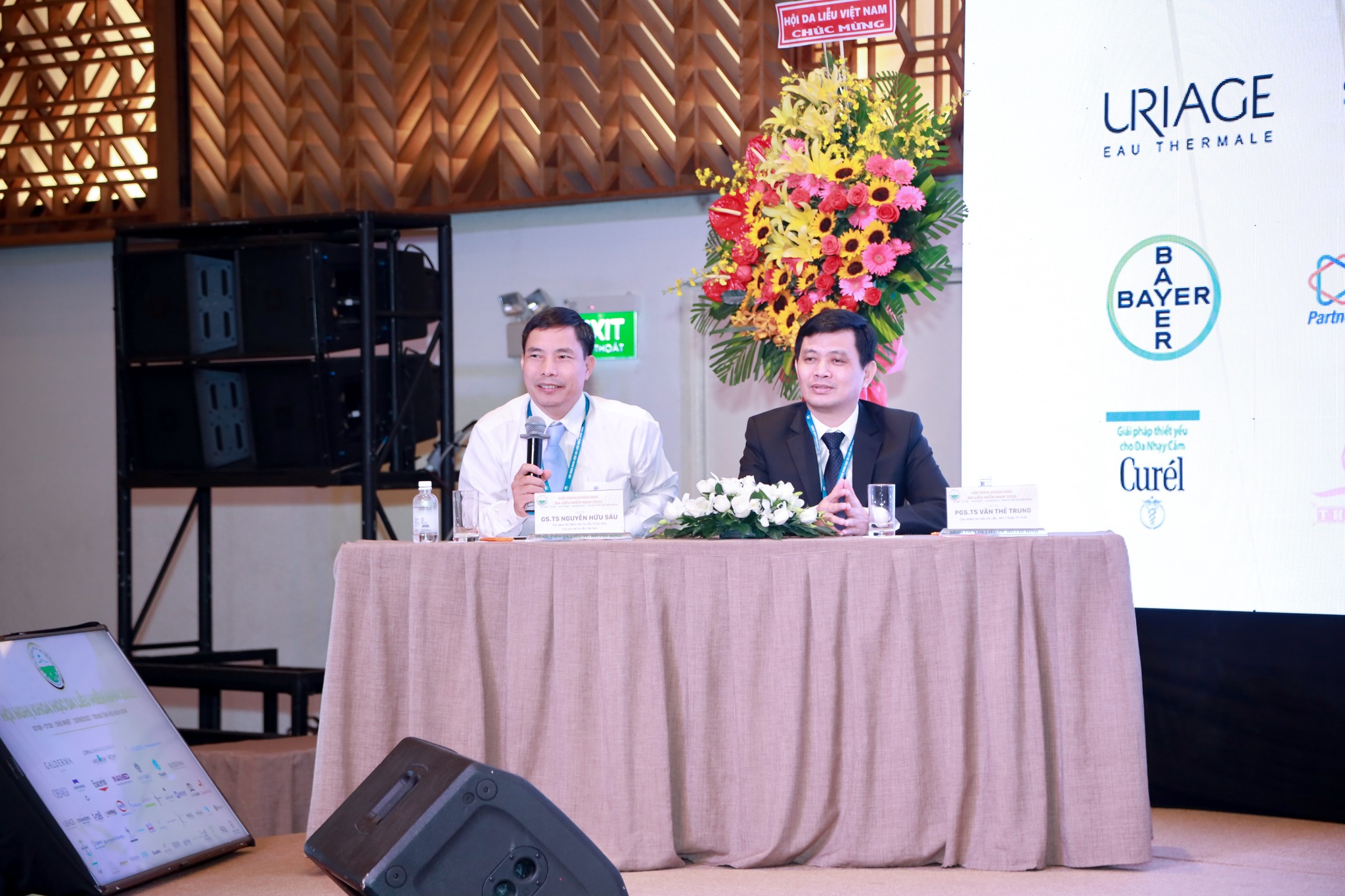 Hình 2: GS.TS Nguyễn Hữu Sáu – Phó Giám đốc Bệnh viện Da Liễu Trung Ương, Chủ tịch Hội Da Liễu Việt Nam và PGS.TS Văn Thế Trung – Trưởng Bộ môn Da Liễu Đại học Y dược TP.HCM đồng Chủ tọa Phiên toàn thể 2 (Nguồn ảnh: Bệnh viện da liễu TP.HCM)